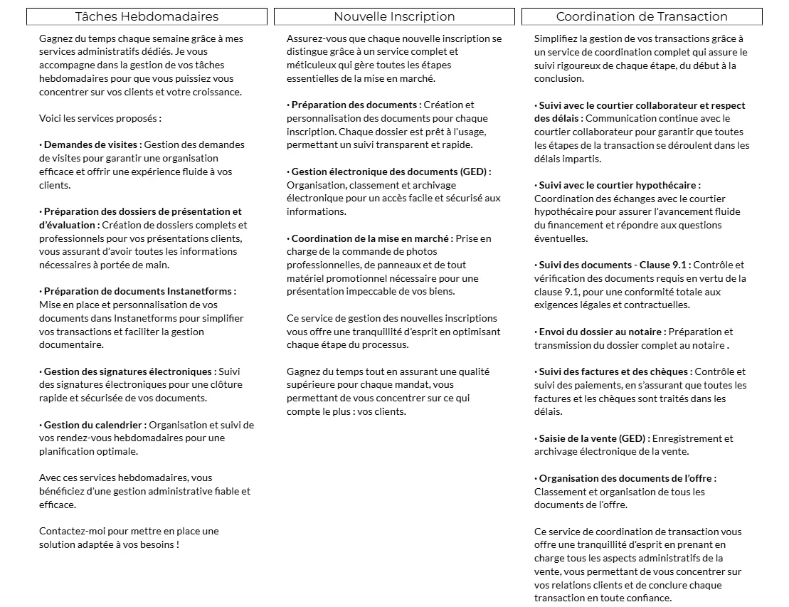 Avec plus de 16 ans d’expérience dans le domaine de l’immobilier et de l’assistance administrative, je vous propose un accompagnement complet et personnalisé pour simplifier votre quotidien professionnel.
